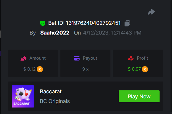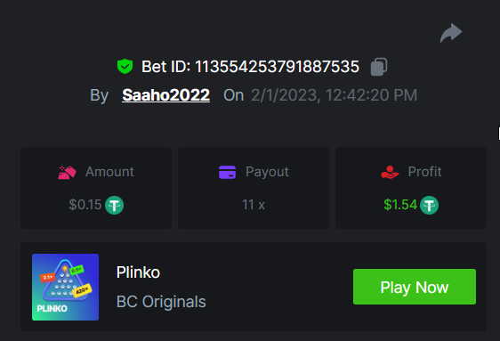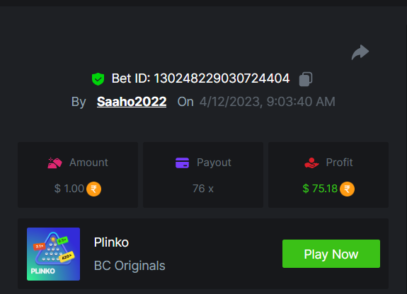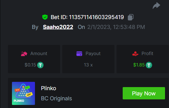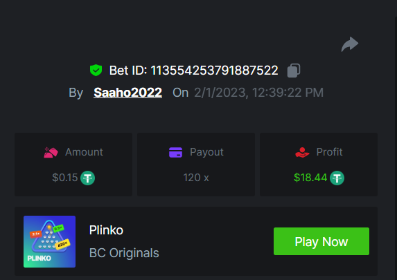 1. EASY link Classic dice 5x https://bc.game/#/sd/117EOWX3F1K1SJ Baccarat 9x https://bc.game/#/sd/117EOZ6USZT7O3 Crash 10x https://bc.game/#/sd/117EP2U6S409AR Egyptian Adventure 10x https://bc.game/#/sd/117EP9B9T7VJ83 Medium Roulette 36x https://bc.game/#/sd/117ENZMSFO2DXV Plinko 76x https://bc.game/#/sd/117EMVH8REZPJN Keno 50x https://bc.game/#/sd/117EMYPFS2740J natural BJ https://bc.game/#/sd/117ENUFTP6WAAB Hard Wheel 49.50x https://bc.game/#/sd/117EPFD06SU9EB Screenshots EASY MEDIUM HARD