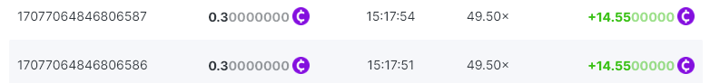 Bounty ? https://bc.game/#/sd/1123A7FXI98S9F The exact amount paid in the game was 50x but the multi shown is 0.05 higher than in reality. Not sure if this counts as bounty. https://bc.game/#/sd/1123L1X3SF7YTV https://bc.game/#/sd/111XF58ISYZR4J https://bc.game/#/sd/111X8MPZ776SYB https://bc.game/#/sd/111XAGX5V8YMMR https://bc.game/#/sd/1121WOEHI0AT5F https://bc.game/#/sd/111XKLL6U67THV